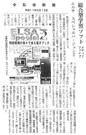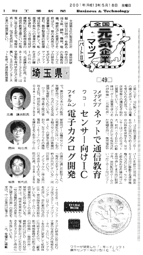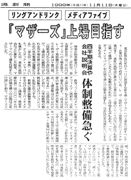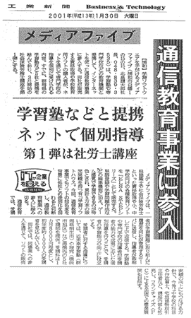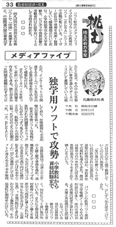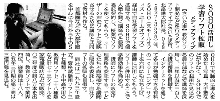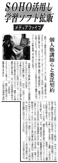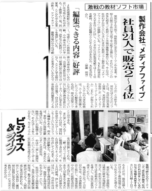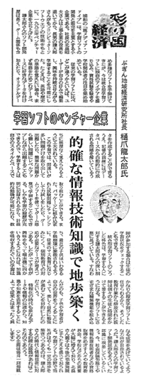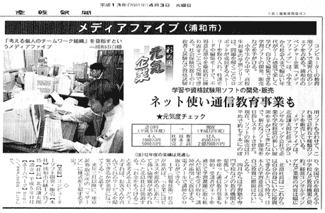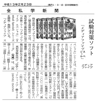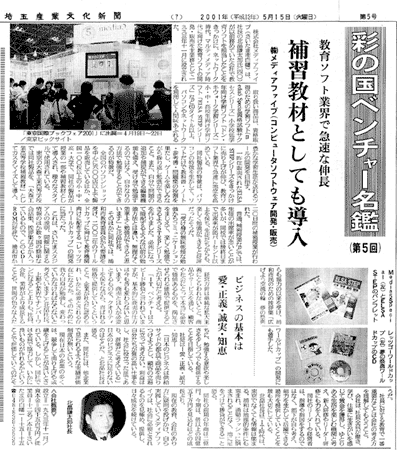 1993年11月、教育用ソフトの開発などを目的に設立。資本金4500万円、社員12名。現在、教育用コンピューターソフト25種、資格試験用ソフト17種など計45種類のソフトを販売。教育用ソフトでは業界8位で、全国100以上の学校に納入されている。2001年3月期は、売上高約2億2400万円の見込み。東京証券取引所のベンチャー企業向け市場「マザーズ」に来年3月以降、株式を上場する方針。 |