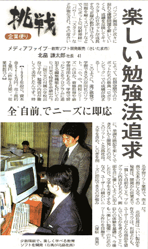 | 急速に進展するIT(情報技術)は、我々のライフスタイルを変えつつある。ゲーム形式の教育用コンピューターソフトなどを開発・販売する浦和市のベンチャー企業「メディア・ファイブ」は、インターネットを活用した通信教育、自習教室事業を提案、県創造的投資育成財団が募集した今年度の「彩の国サクセスプレゼンテーション事業」で優秀賞に輝いた。同社の北畠謙太郎社長(40)に、IT社会における教育のあり方や、起業家の心構えを聞いた。 |
